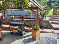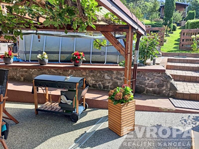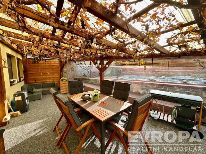Z kuchyně vycházíte přímo na prostornou zastřešenou pergolu orientovanou na jih, která je celá obrostlá hroznovým vínem – ideální místo pro ranní kávu se zpěvem ptáků, letní grilovaní s přáteli, rodinné obědy na čerstvém vzduchu. Hned vedle pergoly je prostor, kde můžete v létě nejen pro děti umístit bazén, jako stávající majitelka.