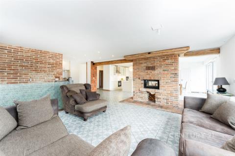Dominantou interiéru je velký otevřený prostor obývacího pokoje, kuchyně a jídelny s centrálním krbem, který prostoru dodává jedinečnou atmosféru. Právě tady si lze představit klidné večery s rodinou nebo přáteli u praskajícího ohně.