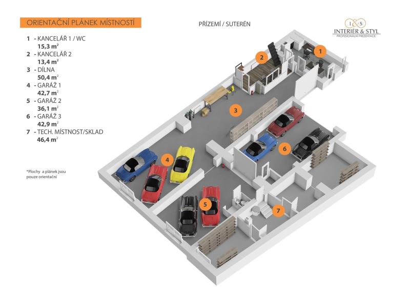 Velkým benefitem je přízemí domu, které lze využít jako plnohodnotné zázemí pro podnikání, dílnu, sklad či garáž. Prostor pojme klidně šest až deset automobilů, ale díky dispozičnímu řešení může sloužit i jako kanceláře nebo showroom – ideální volba pro ty, kdo chtějí mít práci i domov pod jednou střechou.