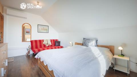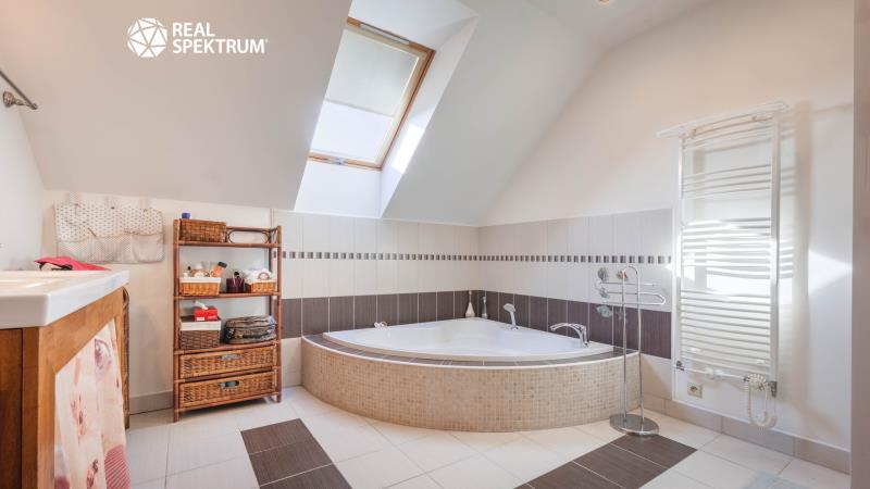 Vybavenost: el. 230/400 V, veřejný vodovod, plyn (topení - ústřední podlahové), kanalizace, klimatizace, alarm a kamerový systém.