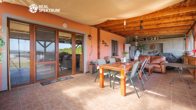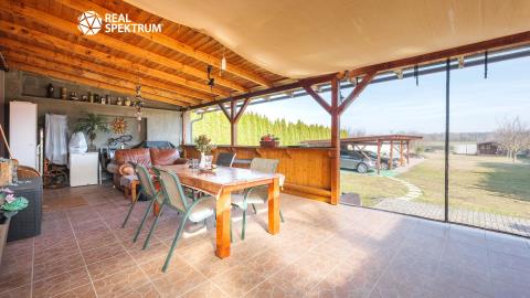 Nemovitost je řešena jako nízkonákladová dřevostavba s velmi dobrými izolačními vlastnostmi a je připravena k okamžitému užívání. Interiér nabízí komfortní obytný prostor s plně vybavenou kuchyní včetně americké lednice s barem a kompletního kuchyňského zařízení. Na obytnou část navazuje prostorná terasa s výhledem do zeleně, ideální pro relaxaci, rodinné posezení i letní grilování, s možností budoucího uzavření pro celoroční využití.