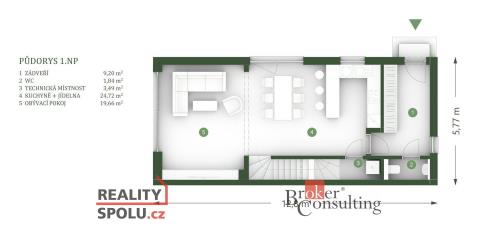 • Obývací pokoj (19,66 m²) – s velkoformátovým HS portálem vedoucím přímo na zahradu