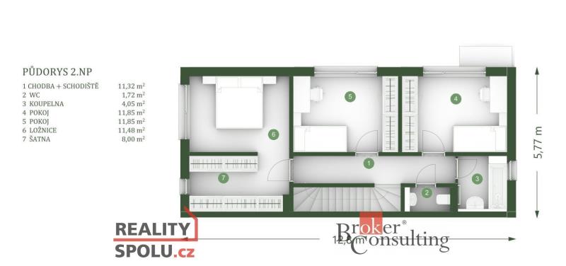 • Tři pokoje (2×11,85 m² a 11,48 m²) – dost místa pro děti, pracovnu i hlavní ložnici