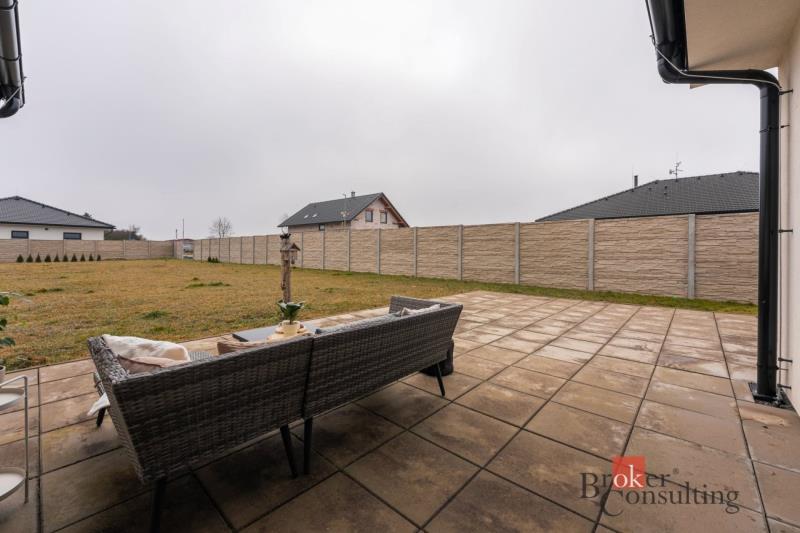 Moderní novostavba rodinného domu s velkou zahradou Nabízíme k prodeji moderní novostavbu rodinného bungalovu v klidné obci Sovinky, na ulici Nad Vinicí. Dům s užitnou plochou 104 m² se nachází na prostorném pozemku o velikosti 1 210 m², který poskytuje dostatek soukromí, prostoru pro rodinný život i relaxaci na zahradě. Dominantou domu je obytný prostor s přímým vstupem na terasu a zahradu díky velkým proskleným dveřím. Dispozice domu nabízí tři samostatné ložnice, koupelnu, samostatnou toaletu a praktickou technickou místnost pro pračku a sušičku. Z hlavní ložnice je navíc vstup do samostatného velkého šatníku s vestavěnými skříněmi. Součástí domu je také částečně pochozí podkroví o velikosti přibližně 15 m², které slouží jako praktický úložný prostor. Dům je vybaven moderními technologiemi pro komfortní a úsporné bydlení. Podlahové vytápění napojené na tepelné čerpadlo spolu s klimatizací a venkovními žaluziemi zajišťuje příjemné klima v interiéru po celý rok i dostatek soukromí. Klimatizaci je navíc možné pohodlně ovládat také prostřednictvím mobilního telefonu. Na zahradě se nachází také retenční nádrž na dešťovou vodu, do které je svedena voda z okapů a kterou lze využít například pro zalévání zahrady. Velkou výhodou je také okolní příroda. Z domu se lze napojit přímo na cyklostezku a v blízkosti se nachází les, který nabízí ideální možnosti pro procházky, sport i relaxaci. Obec Sovinky nabízí dobrou dostupnost do okolních měst. Mateřská i základní škola se nachází v nedalekém Beznu, přibližně 10 minut pěšky od domu. V obci je také večerka a další občanská vybavenost včetně potravin, pošty a bistra v Beznu. Velkou výhodou je také dopravní dostupnost, do centra Mladé Boleslavi se dostanete přibližně za 10 minut a do Prahy zhruba za 28 minut jízdy autem. Tato moderní novostavba je ideální volbou pro ty, kteří hledají klidné rodinné bydlení s velkým pozemkem, moderními technologiemi a výbornou dostupností do města i do Prahy. Rád Vás tímto domem provedu osobně a ukážu Vám vše, co z něj dělá výjimečné místo k bydlení.