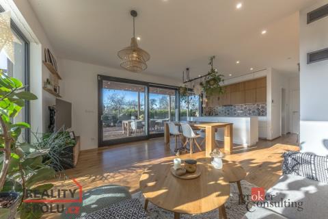 Interiér domu je laděn do svěžího, moderního stylu a je krásně prosvětlen množstvím francouzských oken s izolačními trojskly, která zároveň nabízejí dechberoucí výhledy do zeleně. O útulnou atmosféru se starají krbová kamna, tepelný komfort pak zajišťuje podlahové topení se samoregulační funkcí. Střešní okna jsou vybavena venkovními termo roletami i vnitřním zatemněním, venkovní žaluzie jsou ovládány elektronicky. Vytápění je zajištěno elektro kotlem a ohřev bazénu je prostřednictvím tepelného čerpadla, jsou zde velmi nízké provozní náklady (PENB se dokončuje). Dům je chráněn bezpečnostním systémem. Napojen je na veřejný vodovod, zároveň disponuje vlastní studnou i retenční nádrží na dešťovou vodu. Odpadní vody jsou řešeny domovní čističkou.