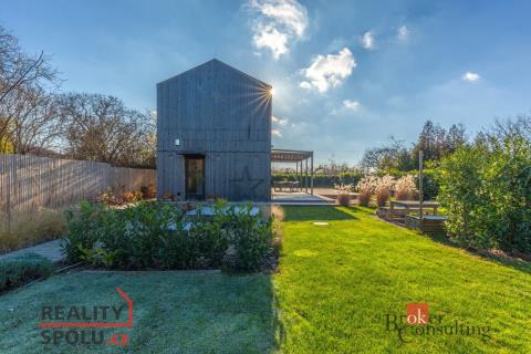 Zahrada je rozdělena na relační a užitkovou část. V relaxační zóně nechybí terasa, pergola, ani vyhřívaný bazén se slanou vodou o rozměru 3 × 8 m, který lze zakrýt pojízdnou dřevěnou terasou. V užitkové části jsou vyvýšené záhony, skleník a dostatek prostoru pro pěstování. Údržbu usnadňuje automatický zavlažovací systém i robotická sekačka. Součástí pozemku je také zahradní domek s dílnou a 3–4 parkovací stání.