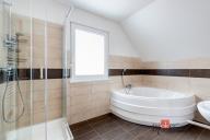 Po schodišti se dostanete do 1. patra, kde je klidová část domu. Najdete zde tři samostatné ložnice, které mohou sloužit jako dětské pokoje, ložnice, pracovna nebo pokoj pro hosty. Dominantou patra je prostorná koupelna, která nabízí skutečný komfort – nachází se zde velká rohová vana i sprchový kout a díky velikosti působí velmi vzdušně a komfortně.