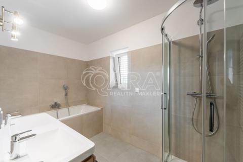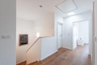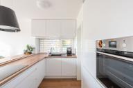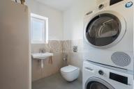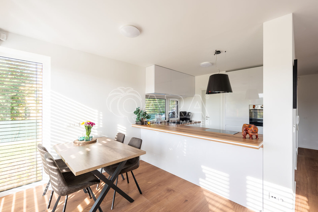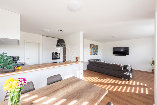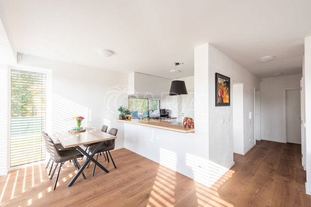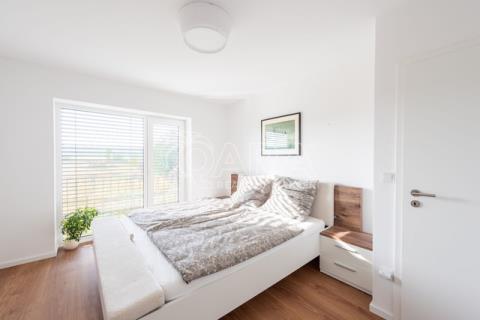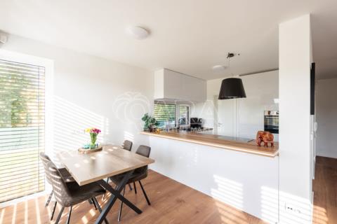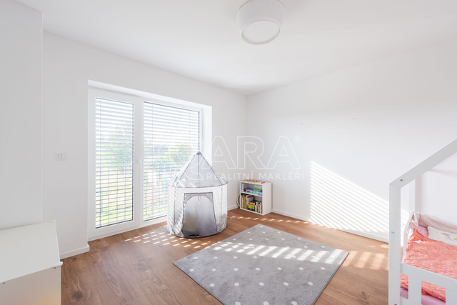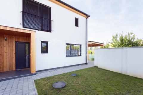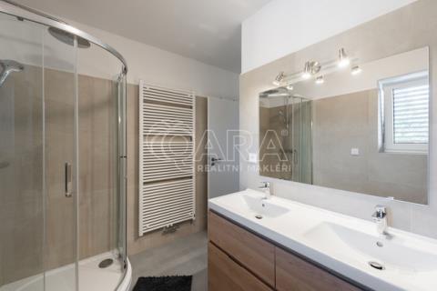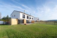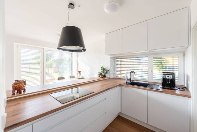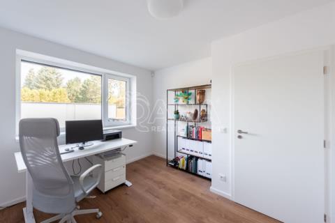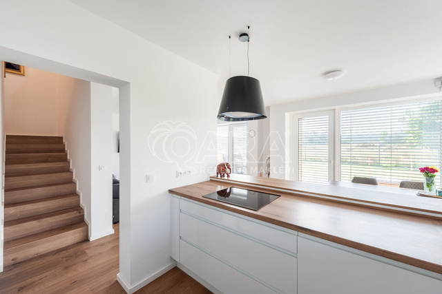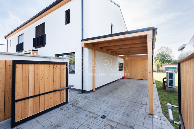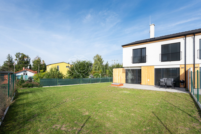 Nabízím k prodeji novostavbu rodinného domu 5+kk (polovinu dvojdomu) z roku 2022. Jedná se o kvalitní zateplenou zděnou stavbu s podlahovým vytápěním napojeným na tepelné čerpadlo (voda-vzduch). Dům je umístěn v klidné okrajové části obce. Na pozemku se nachází zastřešené parkovací stání s navazujícím zahradním domkem o velikosti 5,5 m2. Dům má velmi praktickou dispozici s dostatkem úložných prostor. V přízemí domu se nachází vstupní chodba s vestavěnou skříní, prostorný, jižně orientovaný obývací pokoj s jídelnou se vstupem na vydlážděnou terasu, dále kuchyň a spíž, pokoj o výměře 11 m² (může sloužit jako pracovna nebo pokoj pro hosty) a dále koupelna se sprchovým koutem a toaletou. Kuchyň byla dělaná na míru od společnosti Sykora. Samozřejmostí jsou kvalitní vestavěné spotřebiče značky Electrolux - indukční varná deska, myčka, elektrická trouba, lednice s mrazákem a digestoř značky Elica. Dalším úložným prostorem v přízemí je komora pod schodištěm. V patře se pak nacházejí tři prostorné pokoje, každý o výměře 13 m², šatna s úložným prostorem dělaným na míru, technická místnost s přípojkami na pračku a sušičku s další toaletou, a větší koupelna s dvojumyvadlem, vanou a sprchovým koutem. Výklopným schodištěm je přístupný pochozí půdní prostor vhodný pro ukládání sezónních věci. Podlahy v domě kombinují praktický vinyl a keramickou dlažbu (koupelny a technické místnosti). Okna jsou plastová s izolačními trojskly. Dům je vybaven venkovními hliníkovými žaluziemi s podomítkovým řešením uložení, které zajišťují dokonalé stínění v domě. Instalován je bezpečnostním systém od společnosti Jablotron. Vjezd na pozemek je elektrickou bránou. Dům je napojen na obecní vodovod a kanalizaci, nové plynovodní vedení je dovedeno na hranici pozemku pro případné budoucí připojení. K dispozici jsou i popelnice na tříděný odpad – plasty, papír a bioodpad, za jejichž vývoz se neplatí. Nemovitost se nachází v obci Babice v okrese Praha-východ, která je vzdálená 5km od Říčan a 20km od Prahy. Autobusem se dostanete do Říčan za 15 minut a do Prahy na metro Depo Hostivař za 45 min. V obci a v bezprostřední blízkosti domu se nachází lesy, možnost jízdy na kole, procházek a dalšího vyžití na čerstvém vzduchu. Dále je zde školka, obecní základní škola a Open Gate School - základní škola a gymnázium, fotbalové hřiště s fotbalovým klubem TJ Sokol Babice, tenisový klub, na návsi dále cukrárna/ kavárna, hospoda Na kopečku, obchod a autoservis. Nedaleké Říčany pak nabízejí kompletní občanskou vybavenost včetně škol, školek, plaveckého bazénu, saun, zimního stadionu, lékařů a lékáren, obchodů, restaurací atd.