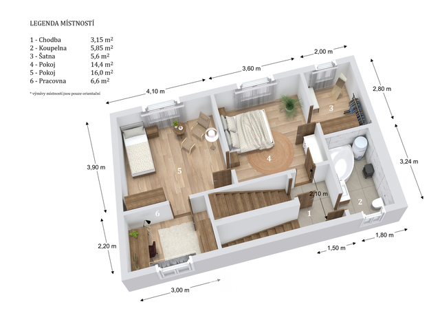 Výměry jednotlivých místností v 2. NP: koupelna - 5,85 m², šatna - 5,6 m², pokoj - 14,4 m², pokoj - 16 m², pracovna - 6,6 m².
