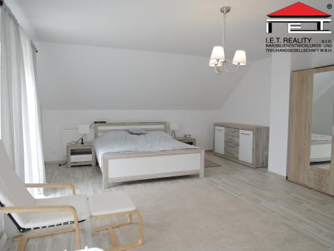 V podkroví jsou dvě velké samostatné ložnice (obě by šly přepažit), jedna z nich má vstupy na dvě terasy (19 a 3,4m2), dále koupelna s rohovou vanou. Z chodby je přístup na půdu.