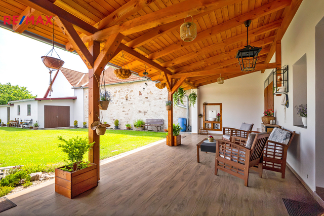Prostorná krytá terasa nabízí dostatek prostoru pro klidné posezení a relaxaci s dostatkem soukromí a výhledem nejen do zahrady.
