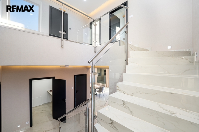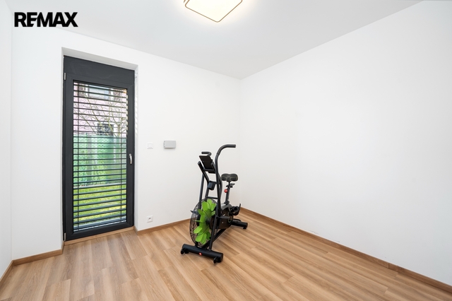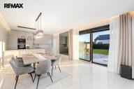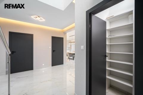 Dům je mimořádně světlý a prosluněný, s velkorysým množstvím přirozeného denního světla, které přináší do každého pokoje pocit vzdušnosti a pohody. Interiér je proveden v jemných světlých přírodních tónech, nadčasových a harmonických, které vytvářejí klidnou a příjemnou atmosféru pro každodenní život. Elegantní kontrastní černé dveře dodávají interiéru moderní nádech a zvýrazňují čistotu a světlost prostoru.