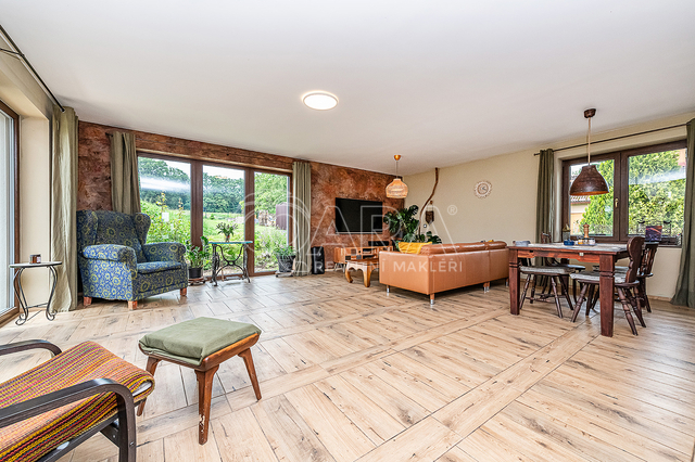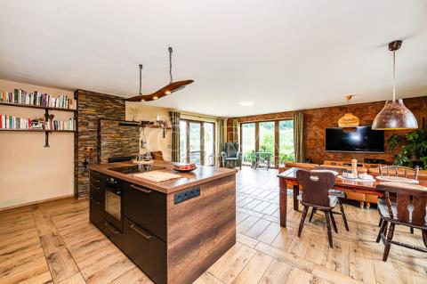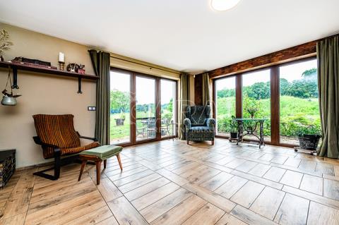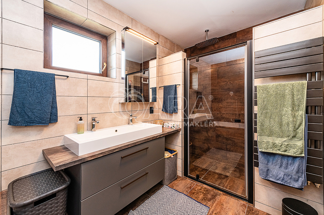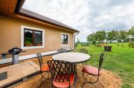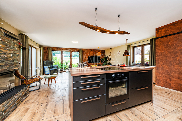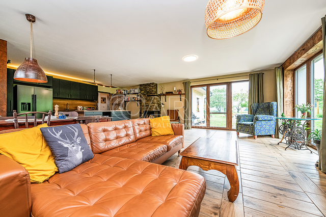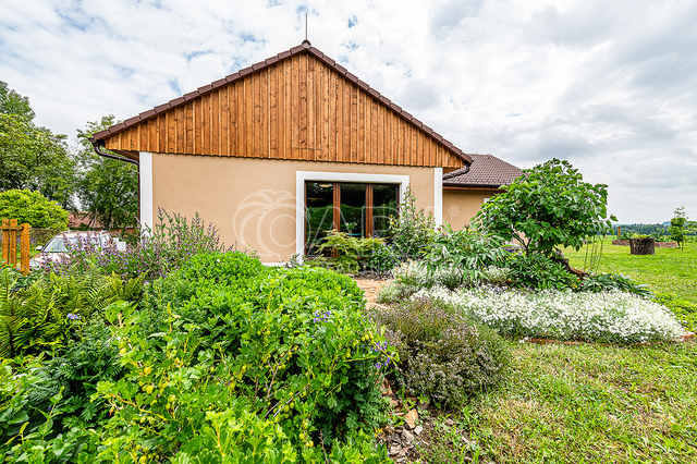 Vytápění a ohřev teplé vody je řešen tepelným čerpadlem vzduch - voda s celkovým ročním nákladem za energie 43 tis. Kč, tj. 3.600,- Kč měsíčně (doloženo vyúčtováním). Topení je v celém domě podlahové. Topit lze i v sálavém krbu a vytopit celý dům. Zdivo porotherm 44 cm, zateplené navíc oproti projektu 4 cm polystyrénem (PENEB bez tohoto dodatečného zateplení), trojtá plastová okna se zesíleným rámem. Kuchyňská linka je plně vybavena, elektrická varná deska, el. trouba, myčka a volně stojící americká lednice. Vlastní vrtaná studna, veřejný vodovod ve výstavbě. Domácí čistička odpadních vod napojena na dešťovou kanalizaci, jímka na dešťovou vodu, dvě plechové garáže (25+ 12m2). Parkování vedle domu pro čtyři auta, oplocení, velký skleník, zabezpečovací zařízení.