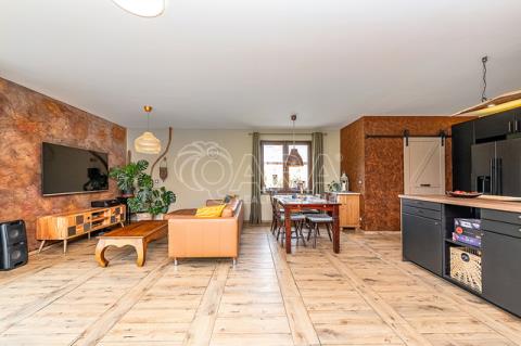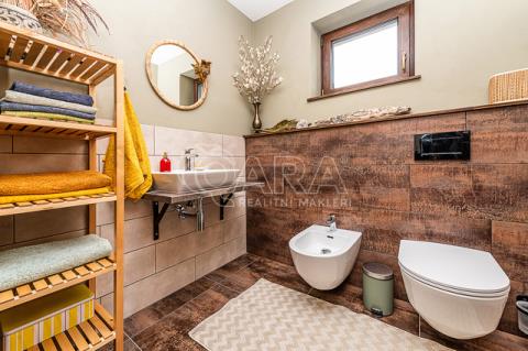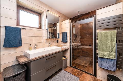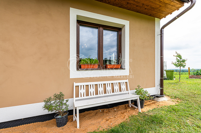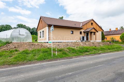 Dům z roku 2021 a má jedno podlaží do písmene L, kde najdete předsíň, technickou místnost, WC s bidetem, prostorný obývací pokoj, moderní kuchyni s ostrůvkem a spíží, koupelnu s vanou a sprchovým koutem, a tři samostatné pokoje.