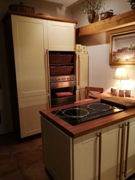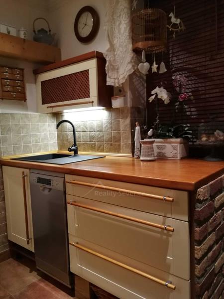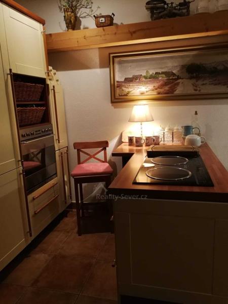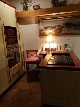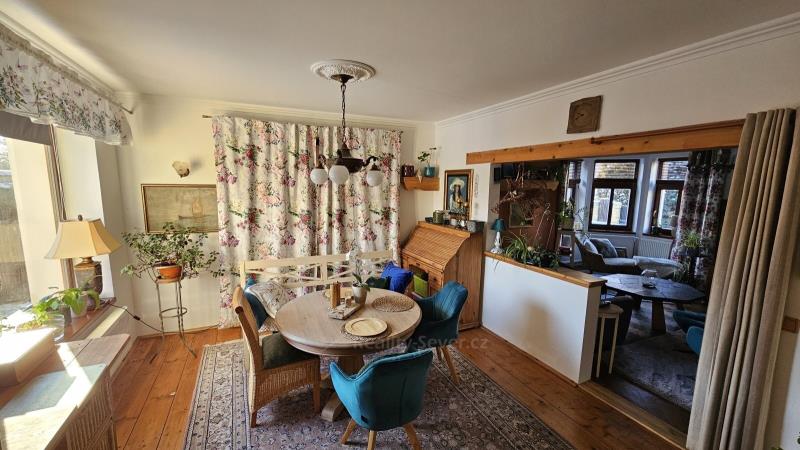 Přes zádveří vejdete do chodby s WC, vstupem do sklepa. Dále je pak kuchyně s východem na zahradu, jídelna, obývák s výklenkem a kachlovými krbovými kamny s výměníkem na vodu. Přikládání do kamen je řešeno z chodby, takže obývák zůstává čistý a bez zápachu. V tomto podlaží je v kuchyni podlahové topení napojené na ústřední plynové topení a na WC je podlahové topení elektrické. V jídelně je původní borovicová podlaha a v obýváku původní dubová parketová podlaha. Obě ve výborném stavu.