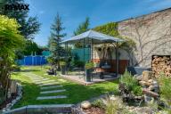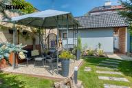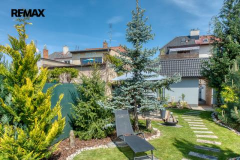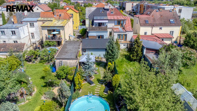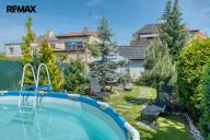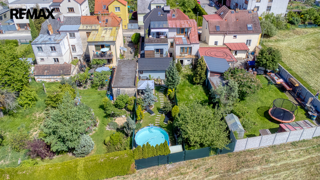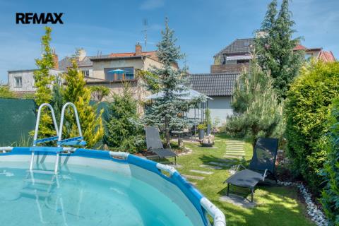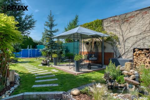 Součástí domu je velmi pěkně udržovaná zahrada s altánkem a nadzemním bazénem, která nabízí dostatek soukromí a prostoru pro rodinnou relaxaci, grilování nebo dětské hry. Zahrada je okrasná, poskytuje příjemné zákoutí i v horkých letních dnech a je ideální pro pěstování květin i drobných plodin.