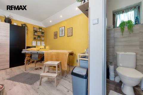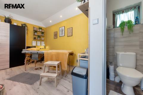 Velkým benefitem této nemovitosti je samostatný zahradní domek, který je zkolaudován pro podnikání a nyní je využíván jako plně funkční masážní salon se sociálním zařízením. Tento prostor je ideální nejen pro masérské nebo kosmetické služby, ale i pro jiné formy podnikání (kancelář, ateliér, obchodní studio, domácí kancelář apod.). Díky oddělenému vstupu si klientelu můžete udržet zcela v soukromí – bez narušení chodu domácnosti.