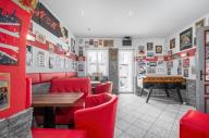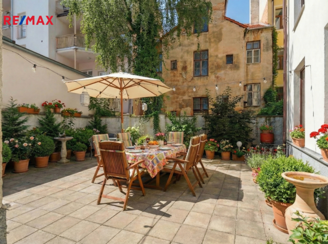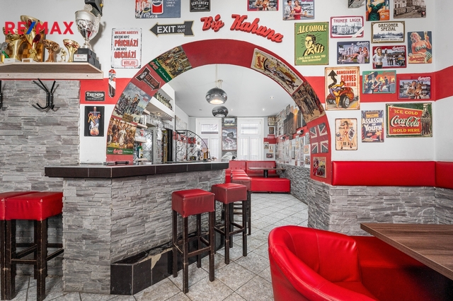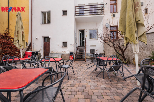 V přízemí domu je aktuálně provozovaný bar 25 m2 s menším zázemím - kuchyní se zavedeným chodem, který disponuje vstupem na velký uzavřený dvůr. Ten dnes slouží jako venkovní posezení pro hosty, do budoucna se však nabízí možnost jeho přeměny na soukromou zahradu, klidný vnitroblok nebo reprezentativní dvorek pro jiný typ provozu.