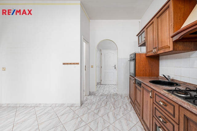 V patře domu se nachází bytová jednotka o dispozici 3+kk, 121 m2, která je vyklizená a nezařízená, připravená k okamžitému využití či úpravám dle potřeb nového majitele. Dominantou bytu je prostorný obývací prostor propojený s kuchyní a jídelnou. Byt dále nabízí ložnici se vstupem na balkon, další samostatný pokoj orientovaný do ulice, dvě komory a šatnu poskytující dostatek úložného prostoru. K dispozici je velká koupelna se sprchovým koutem, WC a rohovou vanou. Byt má vlastní vytápění pomocí kotle a samostatné měření.