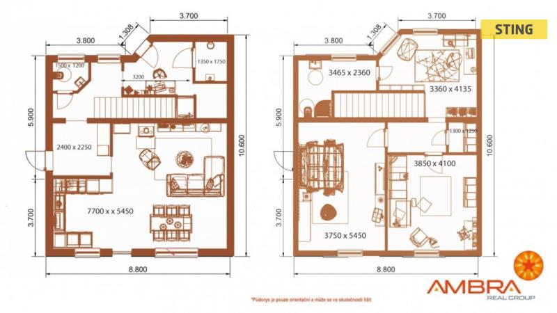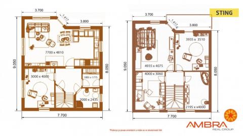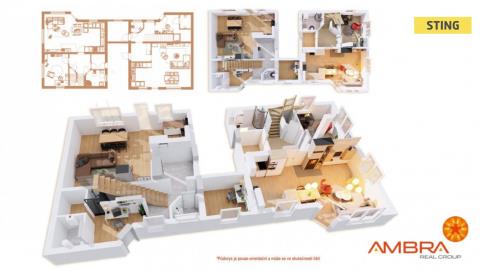 Dům A – dispoziční řešení – zádveří, kuchyně propojená s obývacím pokojem, který má výstup na přední terasu. V obývacím pokoji jsou umístěny krbová kamna, dále v tomto patře máme k dispozici, pracovnu, hostinský pokoj, oba s výstupem na zadní terasu, samostatné WC, sprchu, komoru a technickou místnost. Schodištěm se dostaneme do 2NP. kde se nachází pracovna, 2 samostatné pokoje, koupelna se sprchovým koutem a s WC, komora.
