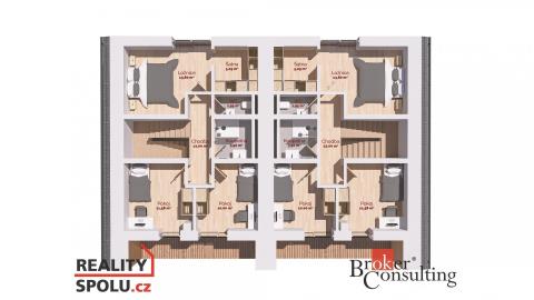 Domy májí dispozici 5+kk s celkovou užitnou plochou 117,4m2. V přízemí se nachází útulný obývací pokoj s krbem a vstupem na terasu, kuchyň s jídelním koutem, pracovna (nebo hostinský pokoj), samostatné WC a technická místnost. V patře naleznete dva dětské pokoje, koupelnu s WC a ložnici s prostornou šatnou.