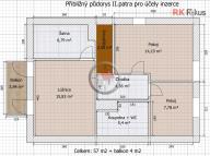 Patro (57 m²): dvě dětské ložnice (snížená podlahová plocha kvůli šikminám) a ložnice s přístupem na balkon (4 m²).