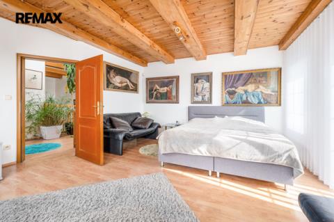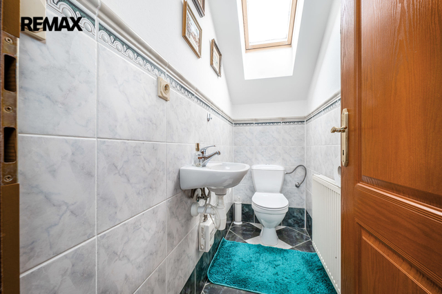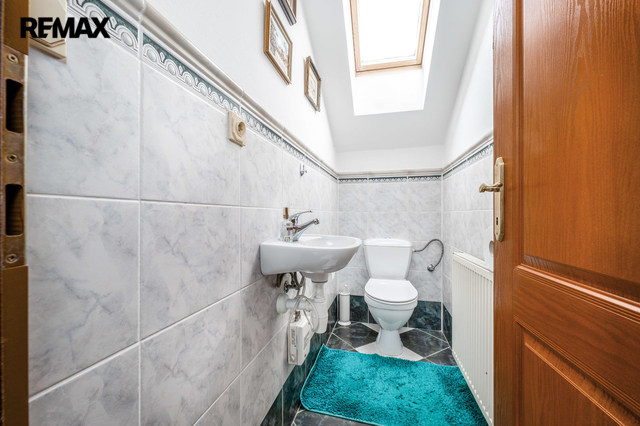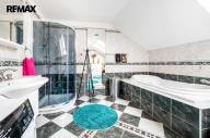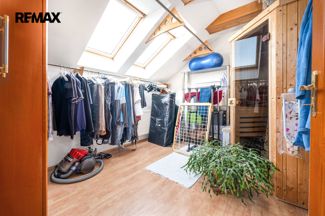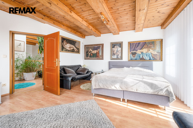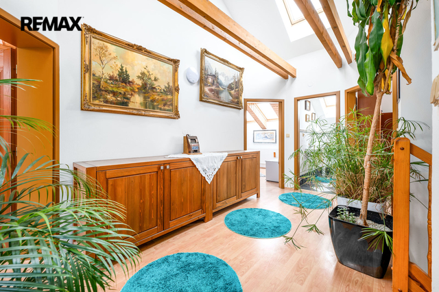 1.patro - na konci schodiště je hala, odtud vstup do hlavní koupelny s vanou a sprchovým koutem, jedna ložnice se vstupem na balkon a druhá ložnice je také se vstupem na balkon, třetí ložnice je upravená na posilovnu se saunou, vedle je samostatné WC. Celkem je v domě 9 místností, dvě koupelny, zimní zahrada.