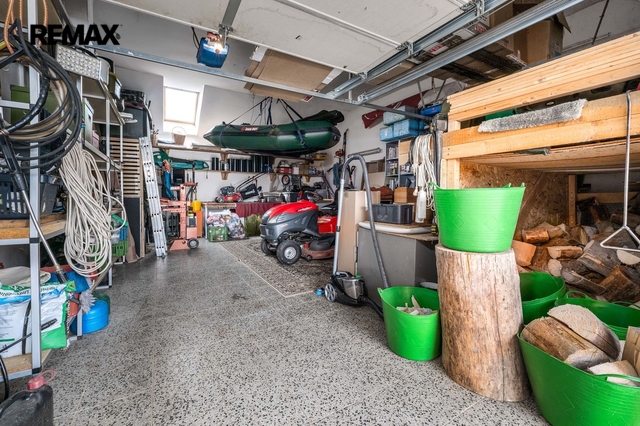 Dům má 2 garáže s dílnou, automatickými vraty na dálkové ovládání, motorový pohon má i vjezdová brána, mezi bránou a garážemi je prostor pro parkování.