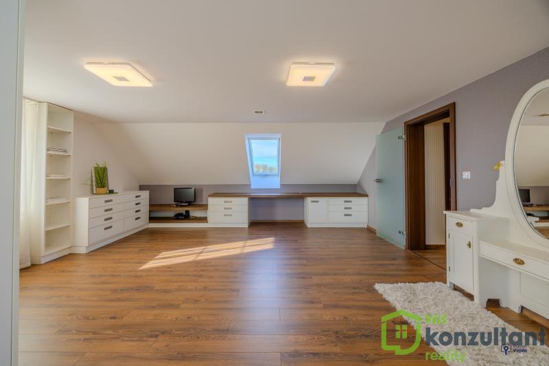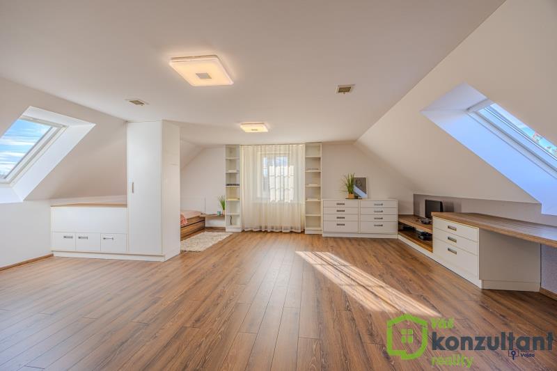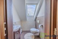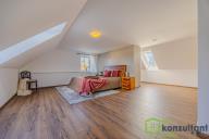 V přízemí veranda s WC, dva pokoje, obývací pokoj s kuchyňským koutem a koupelna s WC. V podkroví potom dva velké pokoje s rozlohou přes 35 m2, každý s vlastní šatnou. Jedna z ložnic s vlastní koupelnou, WC.