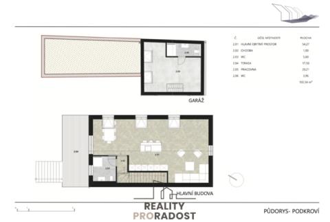 2. NP (obytné podkroví): obývací prostor s jídelnou a kuchyňským koutem , chodba, toaleta, terasa.