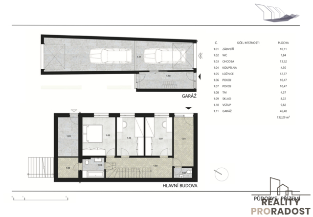 1. NP (přízemí): zádveří, toaleta, chodba, koupelna, ložnice, 2x pokoj, technická místnost, sklad a vstup.