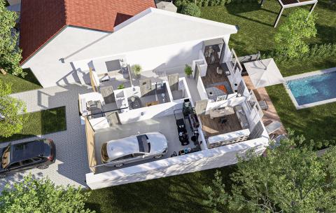 Terasa u domu je ideálním místem pro relaxaci nebo grilování s přáteli. Její finální podobu, a případně bazén, si zařídíte podle sebe. K dispozici je také garáž pro bezpečné parkování vašeho vozu a další parkovací místo na pozemku. Sezónní věci uskladníte na půdě s rozlohou 30 m².