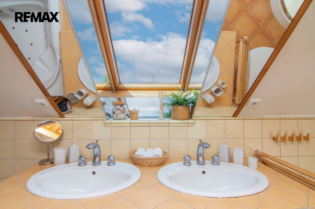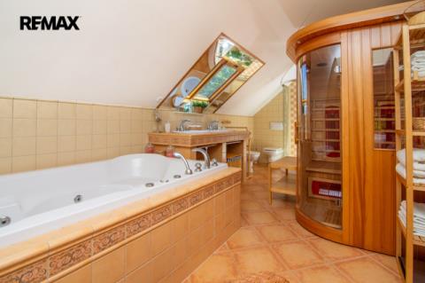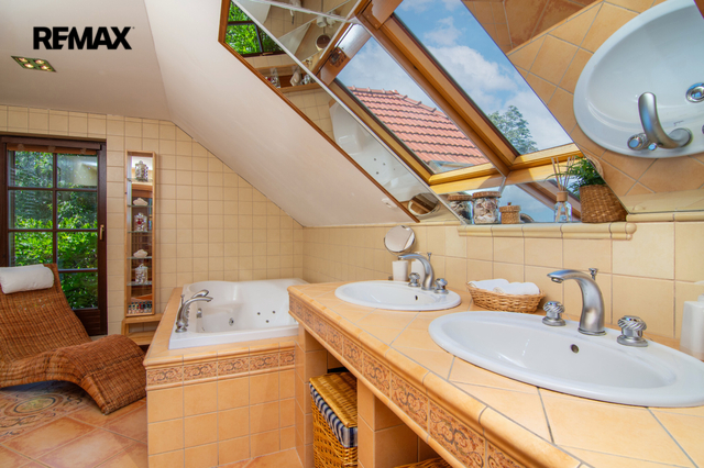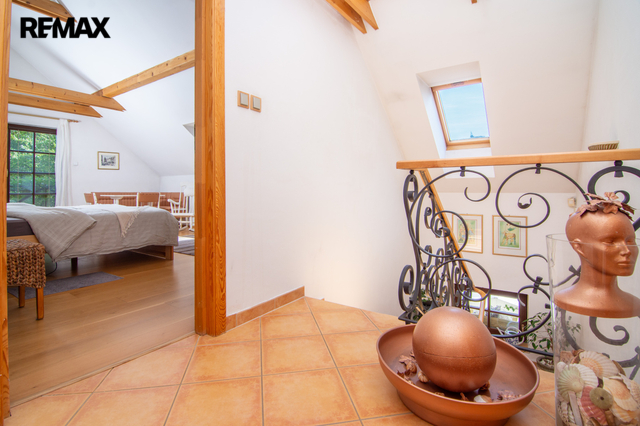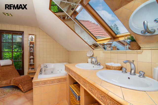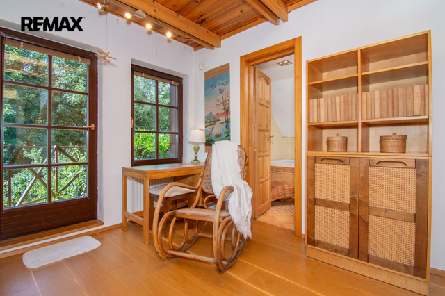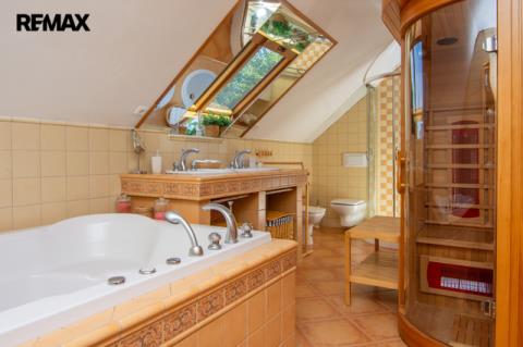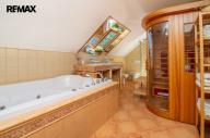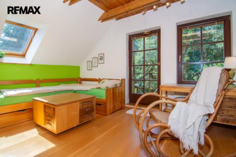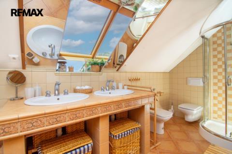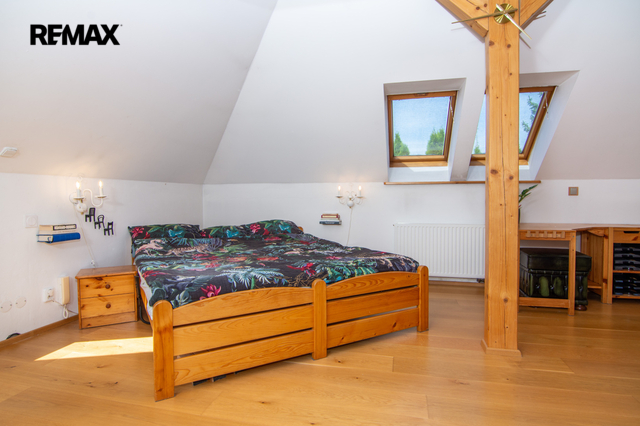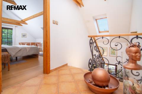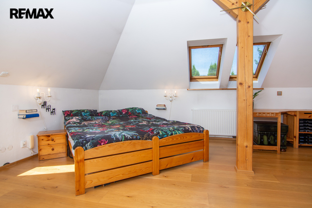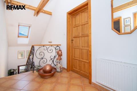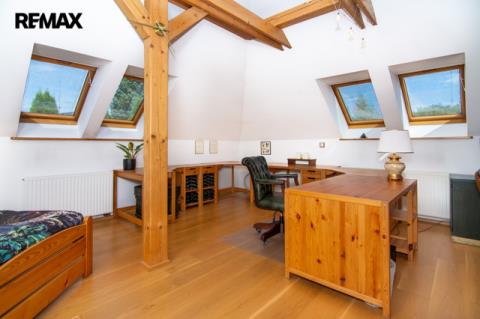 V patře se nachází ložnice (14,3 m2), další samostatný pokoj (18,2 m2) a velkoprostorový pokoj (31,4 m2), jenž můžete využít jako dětský pokoj, pracovnu nebo hernu. Patro navíc zahrnuje koupelnu (11,1 m2) s hydromasážní vanou a infrasaunou, přičemž všechny horní místnosti mají vstup na balkon s výhledem do zeleně.