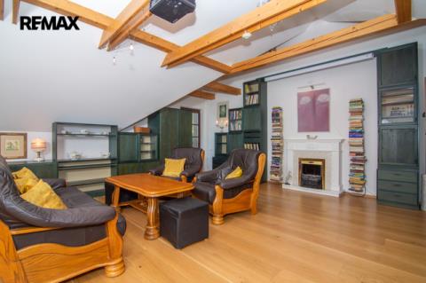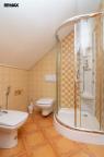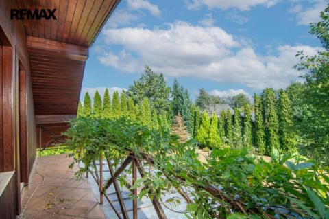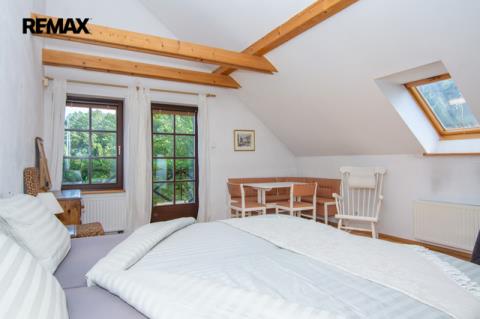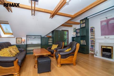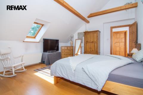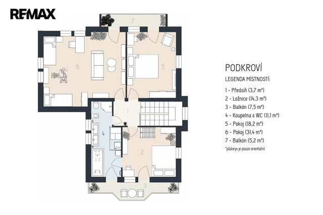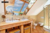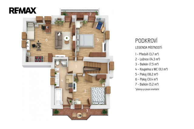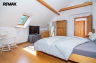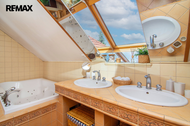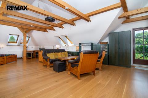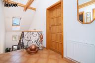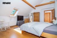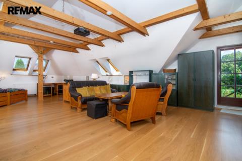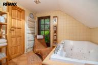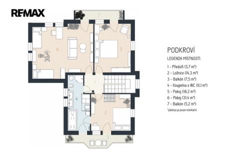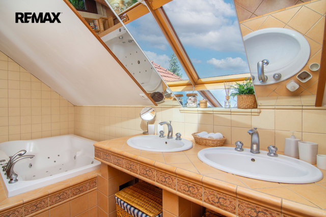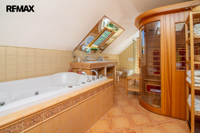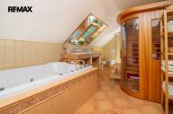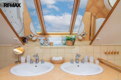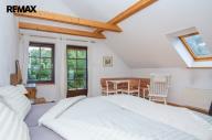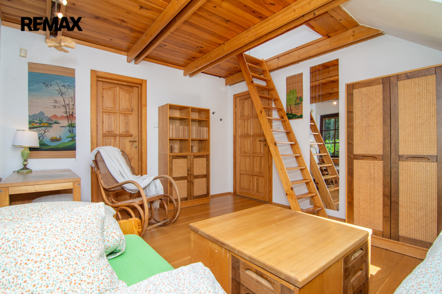 V patře se nachází ložnice (14,3 m2), další samostatný pokoj (18,2 m2) a velkoprostorový pokoj (31,4 m2), jenž můžete využít jako dětský pokoj, pracovnu nebo hernu. Patro navíc zahrnuje koupelnu (11,1 m2) s hydromasážní vanou a infrasaunou, přičemž všechny horní místnosti mají vstup na balkon s výhledem do zeleně.