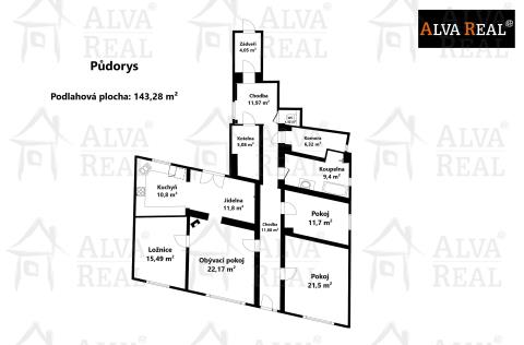 Dispozice: Obývací pokoj 22,17 m²; kuchyň 10,8 m²; jídelna 11,8 m²; ložnice 15,49 m²; pokoj 21,5 m²; pokoj 11,7 m²; koupelna 9,4 m²; komora 6,32 m²; WC 1,32 m²; kotelna 5,08 m²; chodba 11,68 m²; chodba 11,97 m²; zádveří 4,05 m².