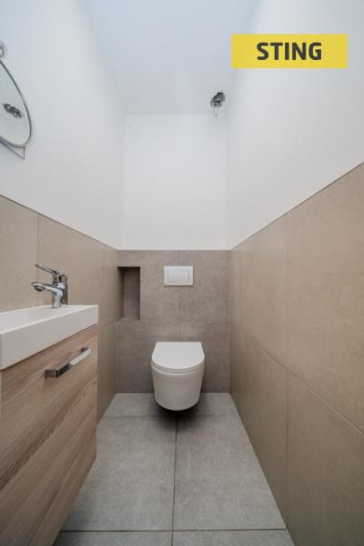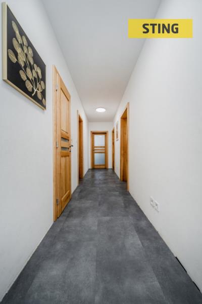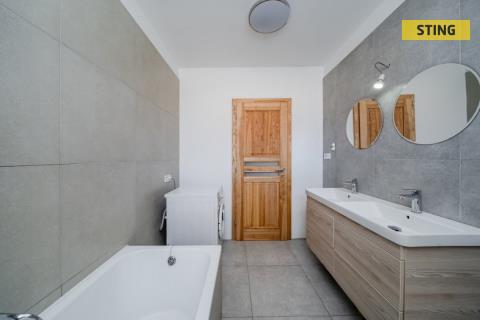 Dále se v přízemí nacházejí dva dětské pokoje, ložnice, koupelna s prostorným sprchovým koutem i vanou, samostatné WC, zádveří a vstup do sklepa i do podkroví přímo z interiéru.