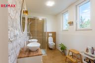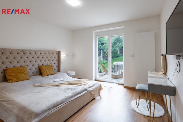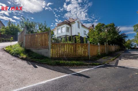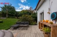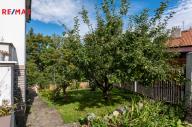 Zahrada o výměře 555 m² s mírným sklonem, samostatný vstup do malého sklepu na uchování potravin a nářadí, terasa 24 m² v 1. NP, balkon ve 2. NP. Parkování přímo před domem pro cca 3 auta.