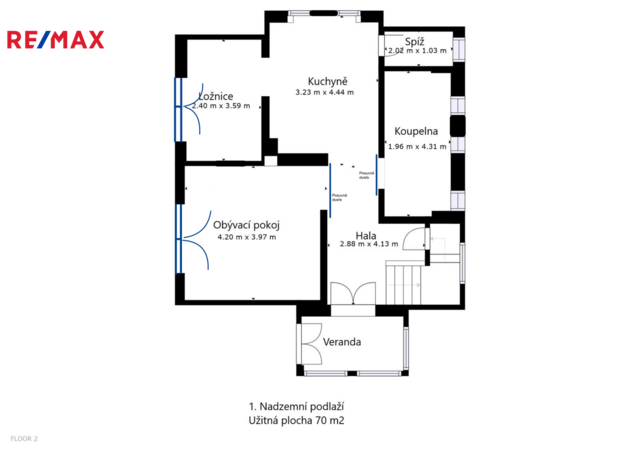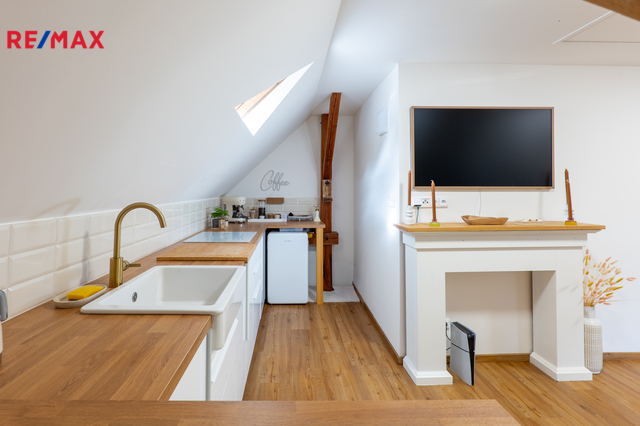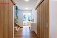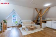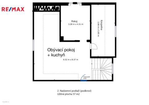 Podkroví (57 m²): jednotka 2+kk s koupelnou a balkonem. Výklopná dvířka se schůdky na půdu.