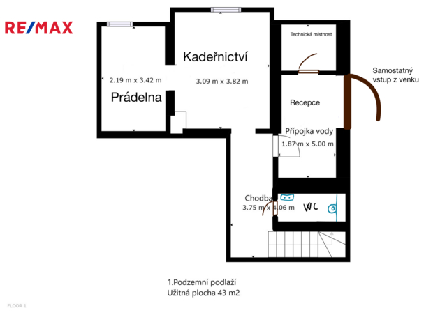 Suterén (43 m²): prostor pro podnikání s technickým zázemím. Vhodné i pro zřízení další bytové jednotky (garsonky).