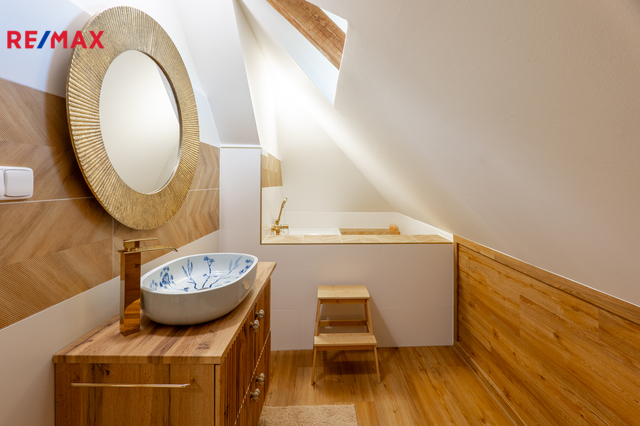 Dřevěný krov ve velmi dobrém stavu, střešní krytina kanadský šindel (stáří cca 20 let).