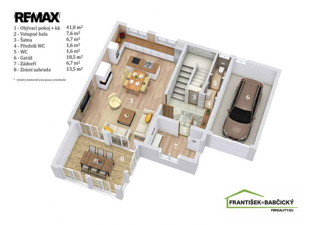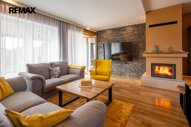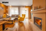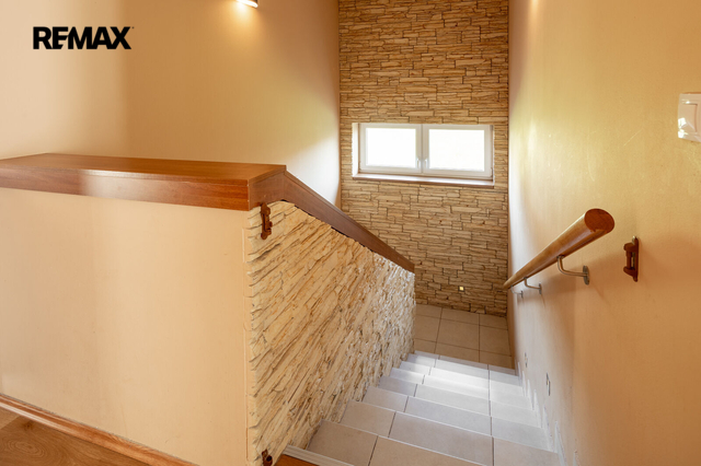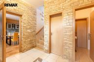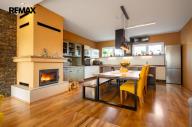 Dominantou přízemí je obytný prostor s krbem a kamenným obložením stěny a kuchyně s ostrůvkem, navazující na zimní zahradu, dále předsíň s chodbou, toaleta a schodiště do patra - 98 m2. Z prostorné garáže (18,5 m2) je vstup přímo v domu.