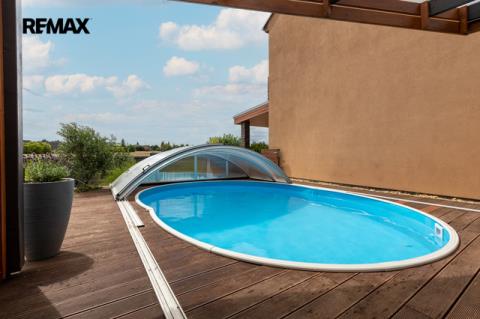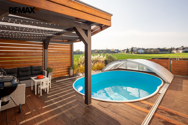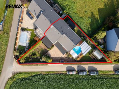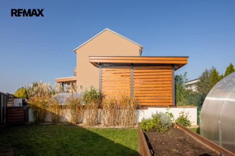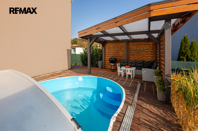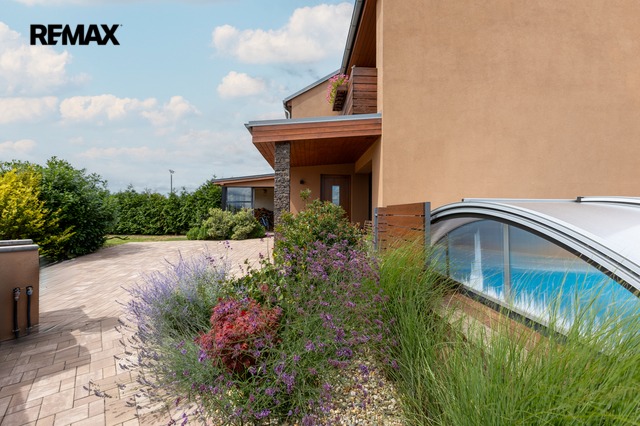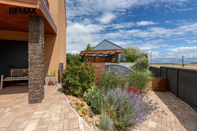 U domu je krásná a udržovaná zahrada se vzrostlými keři. Na dům navazuje terasa, na které je umístěna pergola s posezením, bazén s novým zastřešením. Příjemné zpestření je i skleník a vyvýšené záhony se zavlažováním. Praktický je pak zahradní domek umístěný za domem a nádrž na dešťovou vodu.