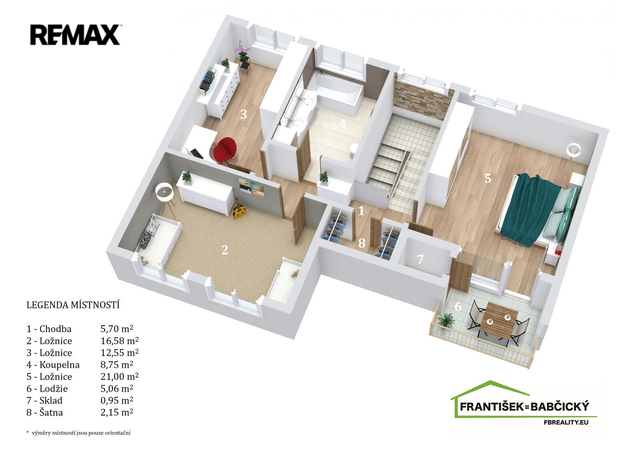 Patro tvoří ložnice 21 m2, ze které je vstup na lodžii, 2 pokoje (16,5 m2 a 12,5 m2), koupelna s vanou a toaletou, chodba, šatna, sklad - 67 m2.