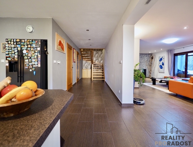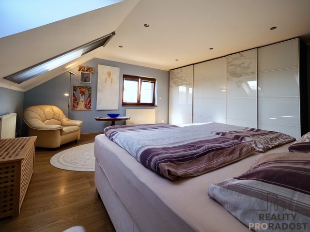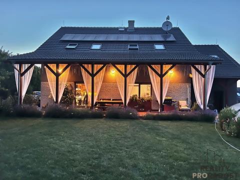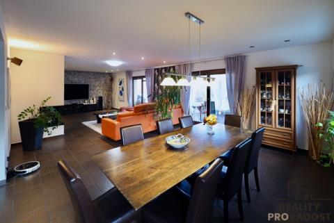 Prodej patrového velice zajímavého rodinného domu o velikosti 4+1, obytná plocha 340m2, garáž s dílnou 63m2, na pozemku 900m2 v Hradečně . Dispozice domu: předsíň se vstupem do technické místnosti s prádelnou a toaletou, prostorná vstupní chodba, prostorná kuchyň se spíží, a jídelnou na jižní stranu navazující na prostornou obývací místnost (120m2), s přímím vstupem dvěma fracouzskými okny na venkovní terasu 30m2, vyloženou venkovními palubkami. Do 1. patra nás dovede samonosné bukové schodiště. V 1. patře jsou 4 pokoje velká koupelna s podlahovým vytápěním se 2. umyvadly, vanou a sprchovým koutem. Obě koupelny jsou vybaveny topnými žebříky. V patře je vstup pomocí skládacího žebříku na půdu, (122 m2) která plochou odpovídá celému vrchnímu patru.
