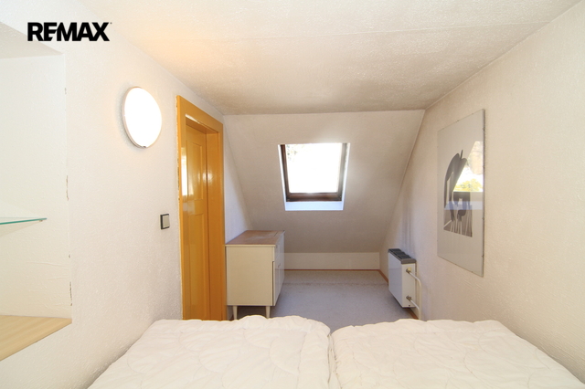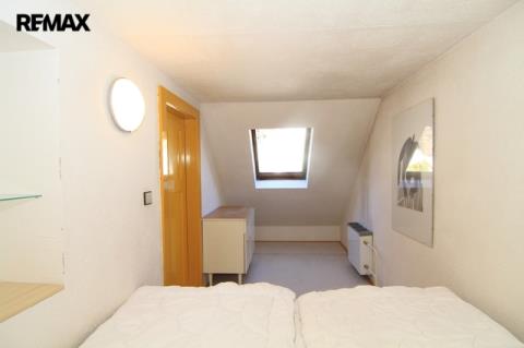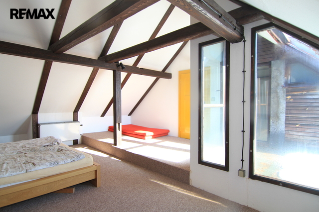 Po dřevěném schodišti se dostanete do patra. Najdete zde opravdu kouzelný pokoj, který může sloužit například jako dětský pokoj nebo pokoj pro hosty. Bez problémů se zde vyspí čtyři lidé a místnost přesto působí velmi vzdušně.