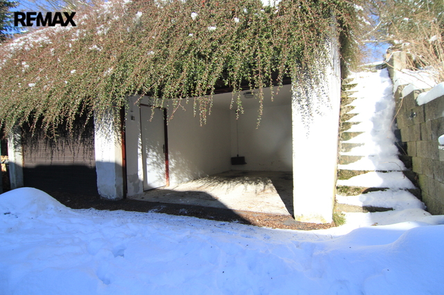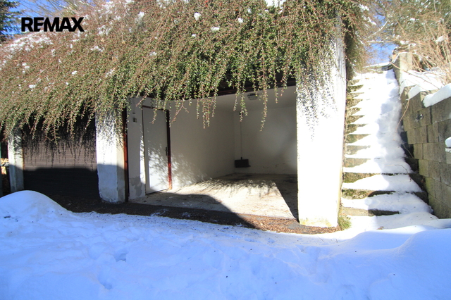 K domu náleží dvojgaráž umístěná přes ulici a za ní terasovitá zahrada, která přímo navazuje na louky a otevřenou krajinu. Větší návštěva může využít veřejné parkoviště vzdálené asi 150 m od domu.