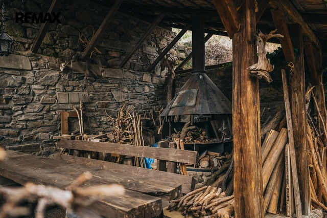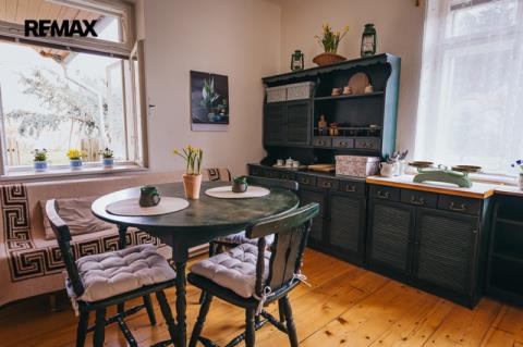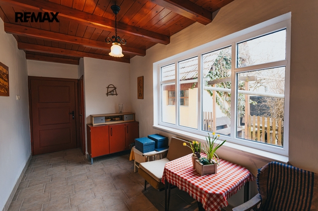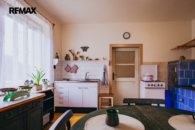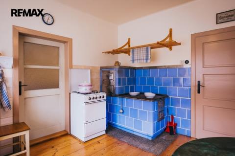 Dům z roku 1952 je pečlivě udržovaný a v roce 2006 byla provedena dostavba verandy. Má atmosféru, kterou novostavby umí málokdy vytvořit. Kuchyň s kachlovými kamny, původní kredencí a prkennou podlahou doplňuje obývák, kde dřevo v kamnech praská jako starý příběh. V každé obytné místnosti i v koupelně jsou kamna — teplo tu není funkce, ale rituál, který vás spojí s rytmem domova a přírody.