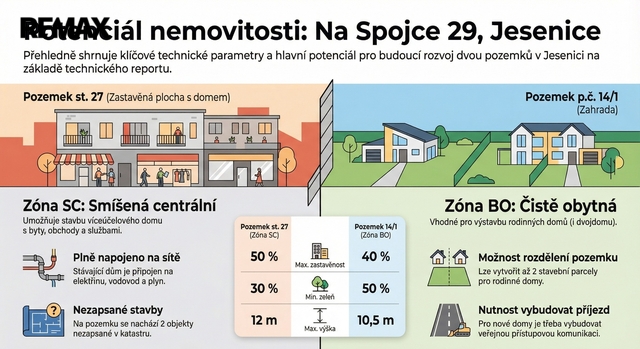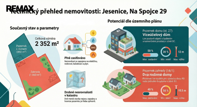 Nabízím k prodeji výjimečný investiční celek v atraktivní lokalitě Jesenice u Prahy, na adrese Na Spojce 29. Předmětem prodeje jsou dva stavební pozemky o celkové výměře 2 352 m², které jsou prodávány jako jeden funkční celek. Součástí nabídky je stávající rodinný dům, který je určen k demolici a jehož hlavní význam spočívá v napojení na inženýrské sítě a v umístění v rámci územního plánu. První pozemek o výměře 492 m² (parc. č. st. 27) je zastavěn rodinným domem č.p. 29 a nachází se v centrální části obce. Druhý pozemek o výměře 1 860 m² (parc. č. 14/1) je veden jako zahrada. Oba pozemky jsou dle platného územního plánu vedeny jako stavební a dohromady tvoří velmi zajímavou rozvojovou plochu s širokým spektrem využití. Pozemek se stávajícím domem spadá do funkční plochy smíšené centrální (SC), která umožňuje výstavbu polyfunkčního objektu, bytového domu nebo kombinaci bydlení s občanskou vybaveností, službami či administrativou. Maximální zastavěnost činí 50 % plochy pozemku, minimální podíl zeleně je 30 % a maximální výška stavby je stanovena na 12 metrů. Tato část pozemku má přímý kontakt s ulicí Na Spojce a je ideální pro komerčně-rezidenční projekt. Navazující pozemek parc. č. 14/1 o výměře 1 860 m² se nachází v ploše obecně obytné (BO). Je určen primárně pro výstavbu rodinných domů a nabízí možnost rozdělení na dvě samostatné stavební parcely, případně realizaci dvojdomu. Koeficient zastavění je zde maximálně 40 %, minimální podíl zeleně činí 50 % a maximální výška zástavby je 10,5 metru. Pro budoucí obsluhu rodinných domů je nutné vybudování nové přístupové komunikace. Stávající rodinný dům je napojen na elektřinu, plyn a vodovod. Veřejná kanalizace je v místě dostupná. Přístup k pozemkům je zajištěn z veřejné komunikace, která je ve vlastnictví města Jesenice. Napojení na inženýrské sítě výrazně zjednodušuje přípravu budoucí výstavby a snižuje vstupní investiční náklady. Lokalita Jesenice patří mezi dlouhodobě vyhledávané oblasti v bezprostřední blízkosti Prahy. Nabízí kompletní občanskou vybavenost, rychlé napojení na Pražský okruh i dálnici D0 a vysokou poptávku po bydlení i službách. Kombinace centrální smíšené zóny a obytné zástavby činí z této nabídky mimořádně zajímavou příležitost pro investora, developera nebo stavebníka s dlouhodobým záměrem. Tento celek umožňuje realizaci projektu s vysokým potenciálem zhodnocení, a to jak formou polyfunkční výstavby, tak rezidenčního bydlení. Jedná se o strategickou nabídku, která se v této lokalitě objevuje jen výjimečně Těším se na setkání a společnou prohlídku.