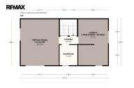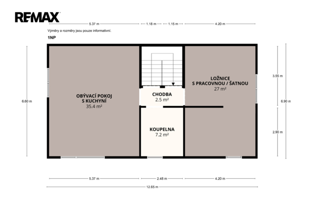 2. Nadzemní podlaží (72,2 m²): obývací pokoj s kuchyňským koutem (35,4 m²), chodba (2,5 m²), pokoj se šatnou / pracovna (27 m²), koupelna (7,2 m²)