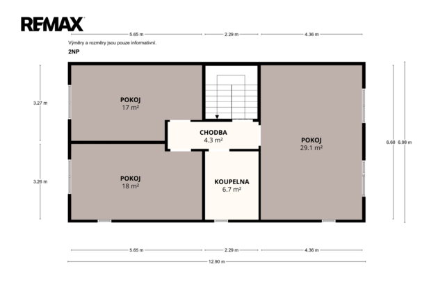 3. Nadzemní podlaží (75 m²): tři pokoje (29,1 m², 18 m² a 17 m²), koupelna (6,7 m²) a chodba (4,3 m²)